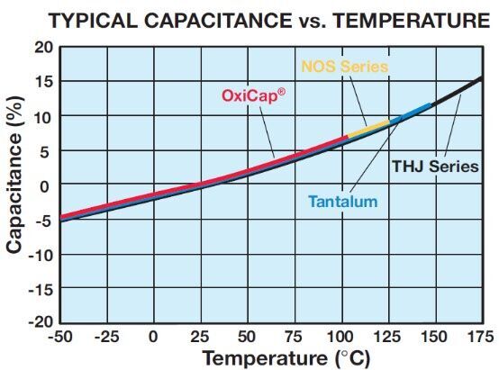 ESR和阻抗都随频率的增加。在较低频率值作为额外的贡献分歧阻抗(由于电容器的电抗)变得更加重要。除了1MHz的(和超越电容的谐振点)阻抗再次增加由于电感,电容的。典型ESR和阻抗值是类似的钽,铌氧化物材料,从而在相同的图表都有效钽电容和OxiCap®电容器。