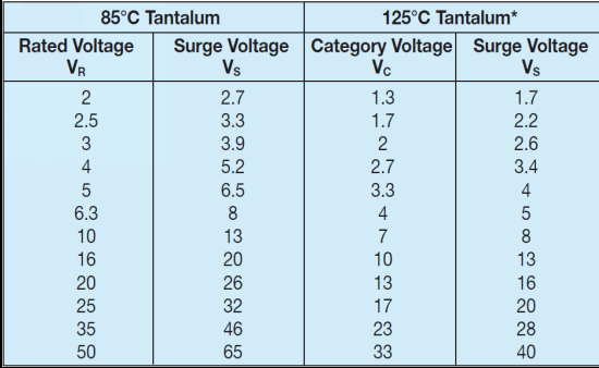 不同温度下浪涌电压的值是不一样的,在85度及以下温度时,分类电压VC等于额定电压VR,浪涌电压VS等于额度电压VR的1.3倍;在85到125度时,分类电压VC等于额定电压VR的0.66倍,浪涌电压VS等于分类电压VC的1.3倍。