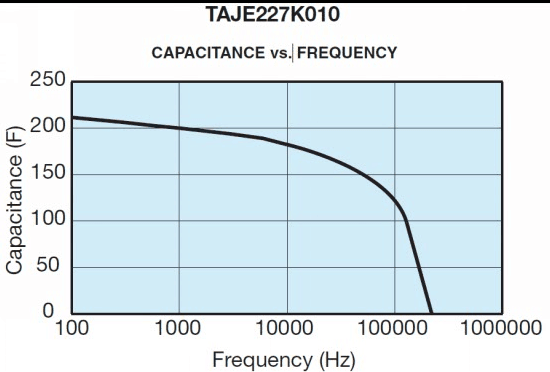 AVX钽电容随着频率的增加有效电容的值会减小,直到共振达到(通常视0.5 - 5MHz的之间该评级)。除了共振频率的设备变得感性。除了100kHz的电容继续下降。